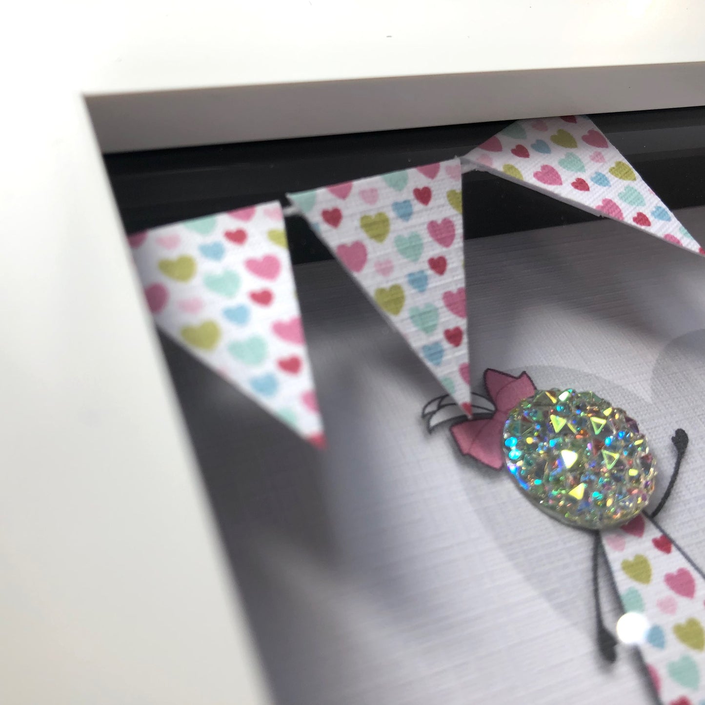 Featuring two adorable figures with sparkling heads and colourful heart bunting, this gift is truly one-of-a-kind. The acrylic pink crystals at the bottom of the frame and the dazzling diamante heart embellishment make it even more special. A must-have for any Mum who loves unique and thoughtful gifts!
